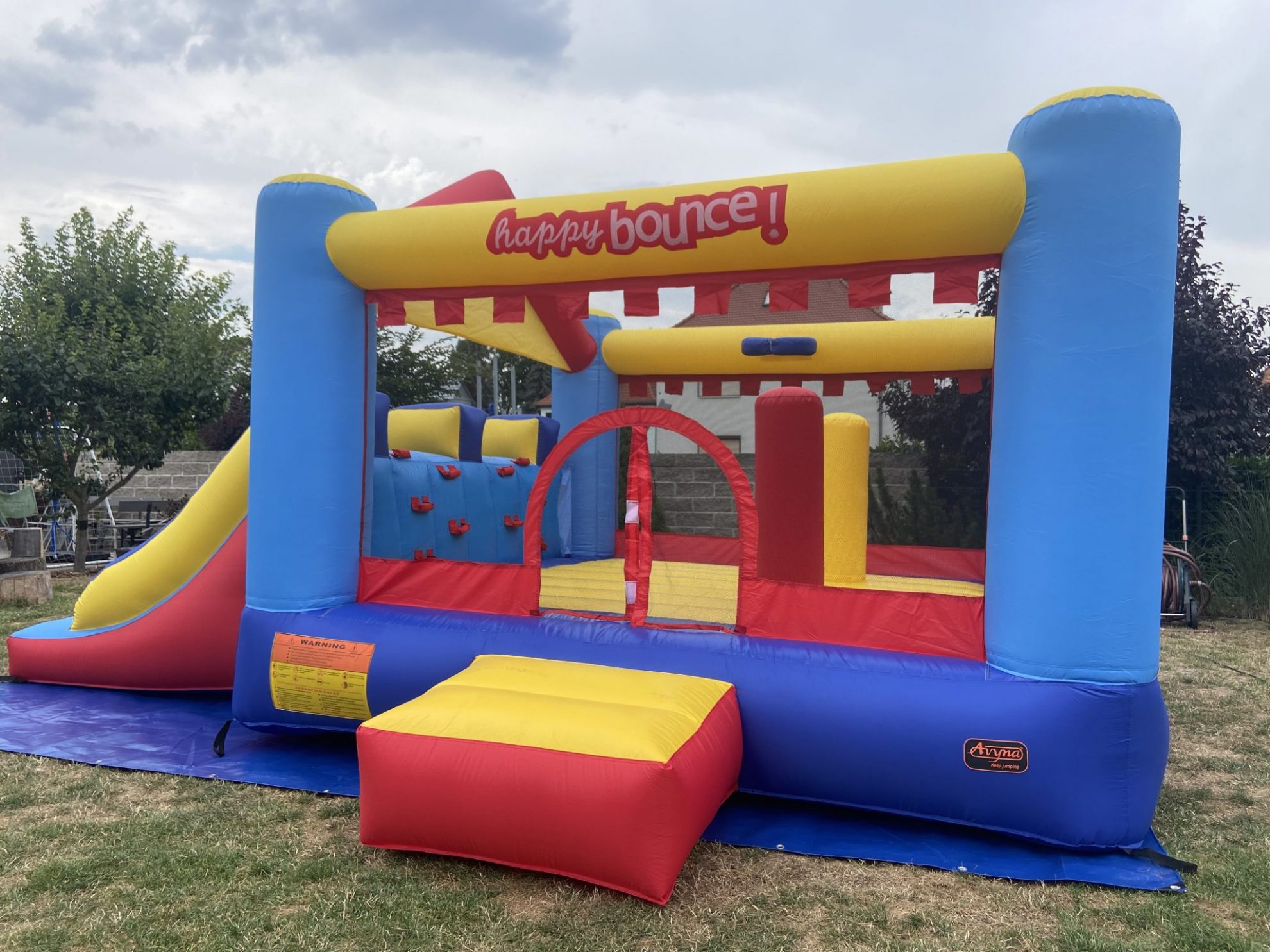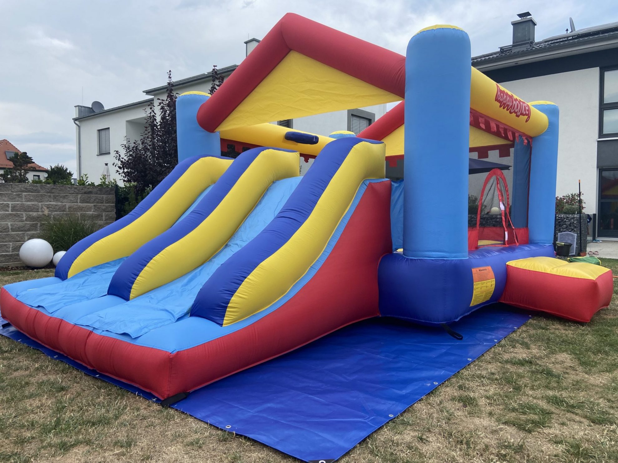Unsere " happy bounce " von Avyna ist eine schöne Hüpfburg, die ähnlich wie die klassische Hüpfburg "Super Castle XL" ist. Sie bietet im Unterschied zur Hüpfburg Super Castle XL, zwei Rutschen, die höher und länger sind. Der Hüpfbereich ist genauso groß, also ca. 9m². Weiter finden die Kinder im Hüpfbereich 2 Luftpolster oder auch Dummys, wo mal so richtig Dampf abgelassen werden kann. Dazu gibt es in der Mitte der Sprungfläche noch einen Basketball-Korb. Es gibt also so viel zu entdecken, dass jedes Kind garantiert auf seinen Geschmack kommt.