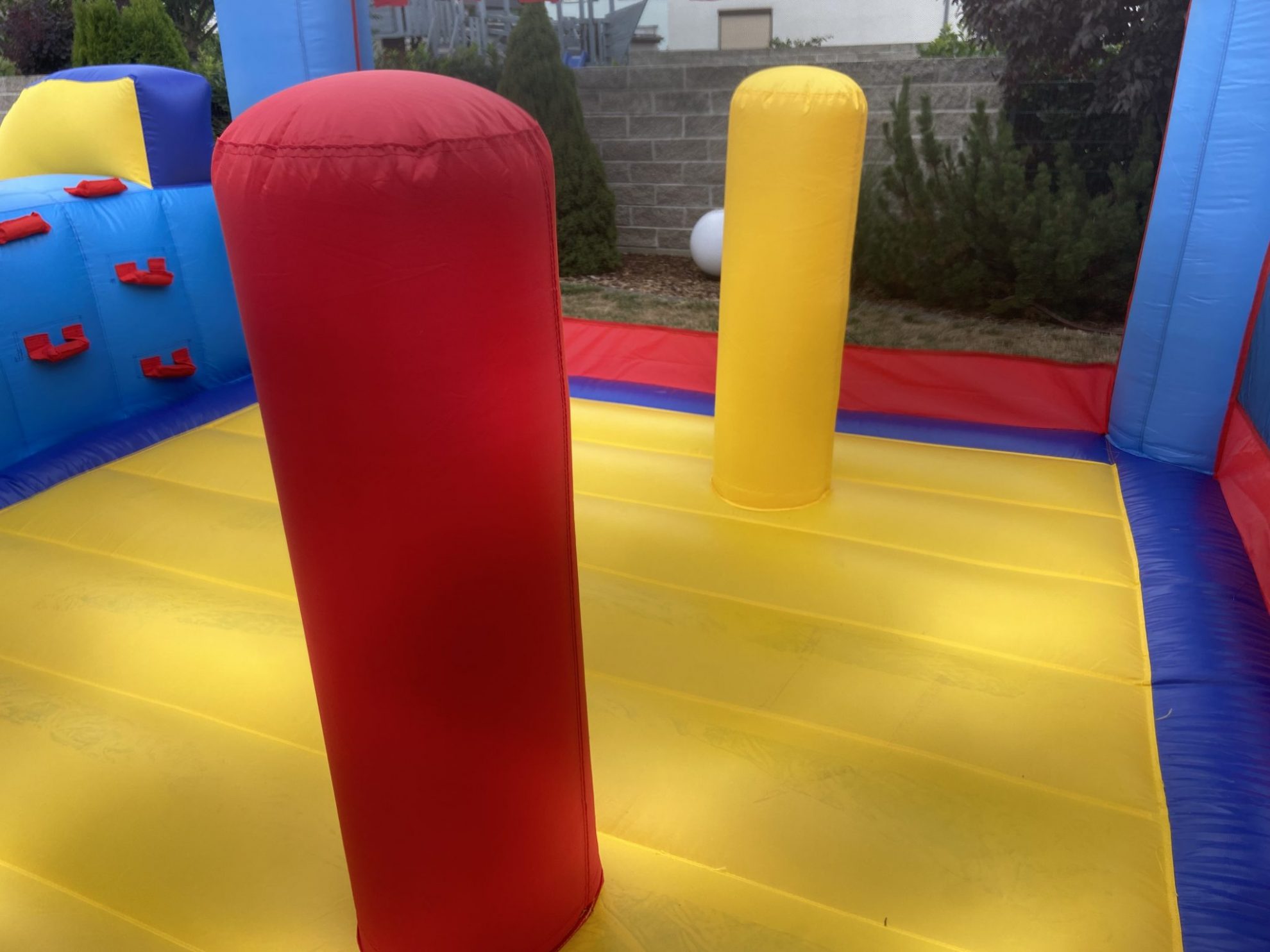 Dann geht es durch das Bällebad und dann durch die Tunnel um auf dem Mittelfeld eine Art Basketball-Spiel im Hüpfburg-Format zu spielen. Wenn der Ball im Korb ist, kann es weiter zum Erklimmen der Rutsche gehen. Nach der Rutsche ist das Ziel erreicht und die Zeit wird gestoppt.