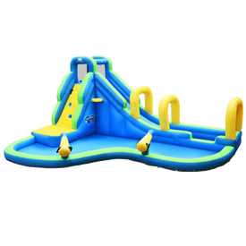 Die aufblasbare Hüpfburg "Wasserpark" ist ein vielseitiges Spielgerät für Kinder im Alter von 4 bis 12 Jahren. Sie bietet diverse Spielbereiche wie Rutschen, Spielpools, Kletterwände und Basketballkörbe. Die Hüpfburg ist aus reißfestem Oxford-Stoff gefertigt, misst 478 cm x 366 cm x 242 cm und hat eine Tragfähigkeit von 120 kg. Sie wird mit einem Gebläse, Wasserpistolen, Heringen, einer Tragetasche und Reparaturzubehör geliefert.